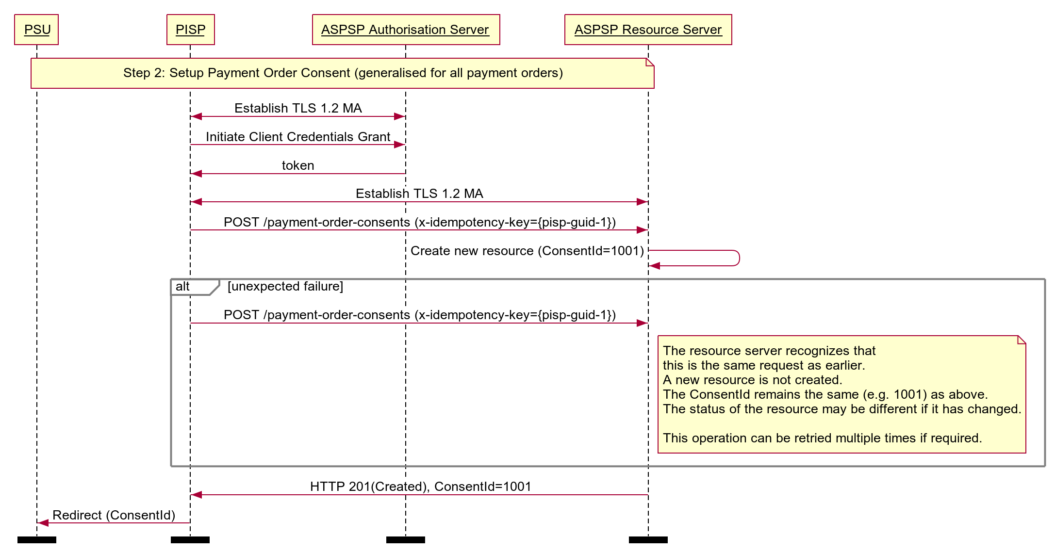PISP -> ASPSP Resource Server: POST /payment-order-consents (x-idempotency-key={pisp-guid-1})