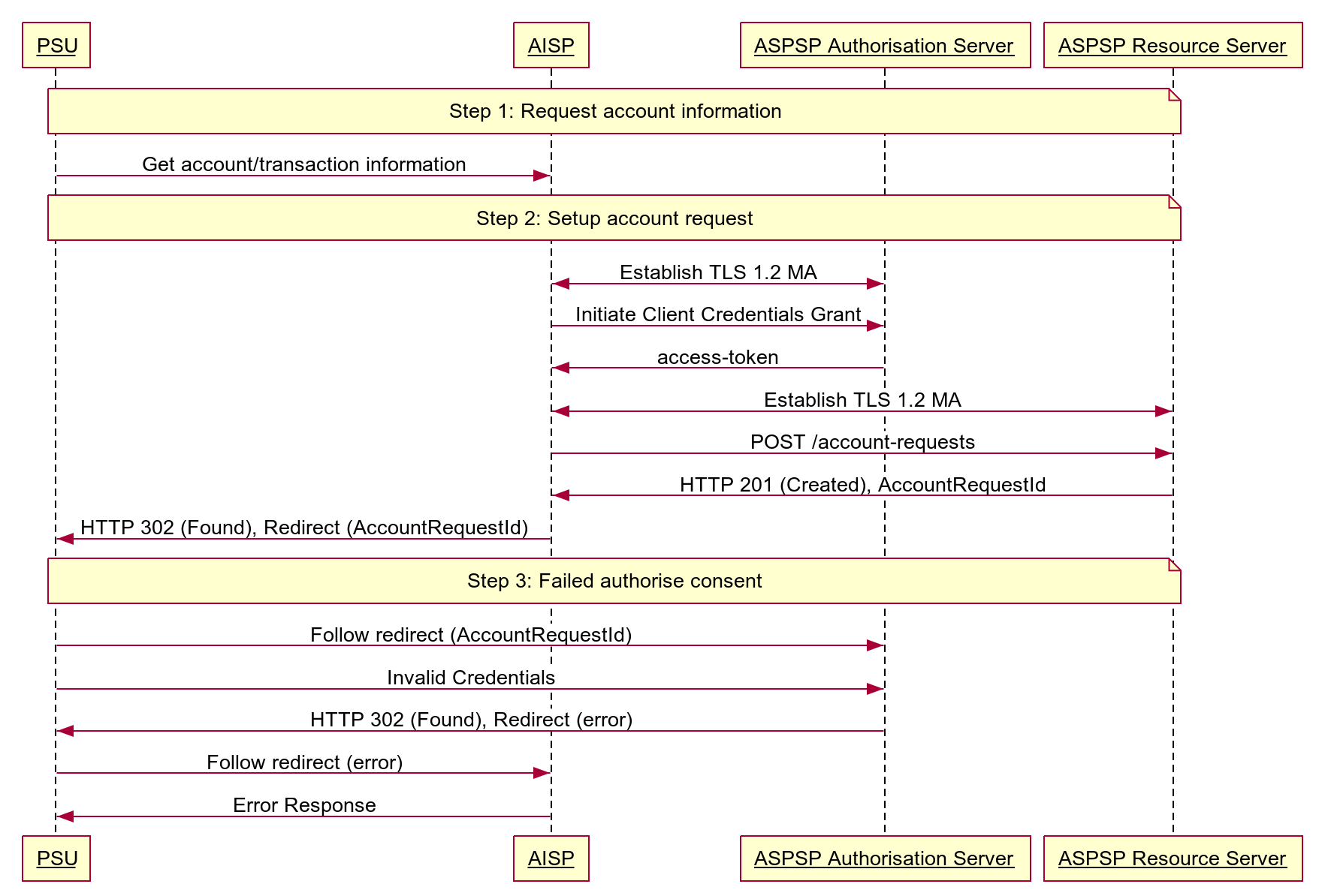 The Step 3: Authorise Consent Flow fails to succeed due to the PSU providing invalid credentials to the ASPSP, resulting in no Authorization Code being generated.